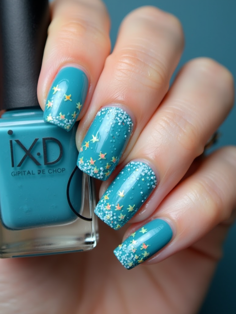 nails with underwater ocean scene featuring tiny sea creatures, vibrant blue ombré background, trendy and bold hand styling