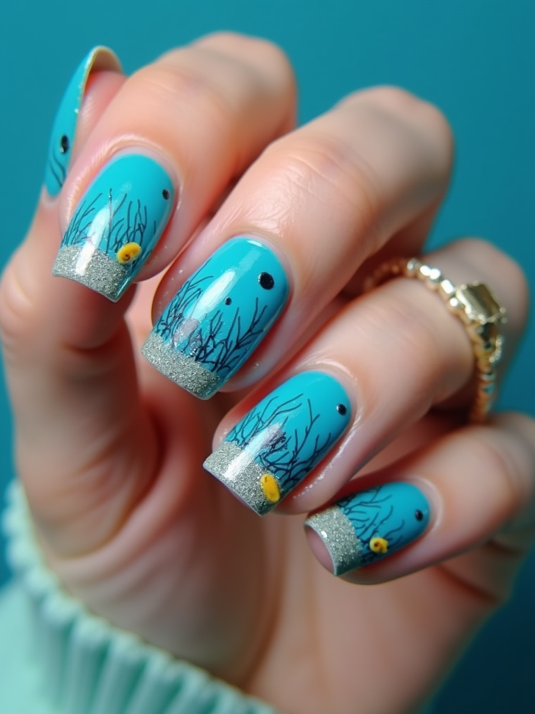 nails with underwater ocean scene featuring tiny sea creatures, vibrant blue ombré background, trendy and bold hand styling