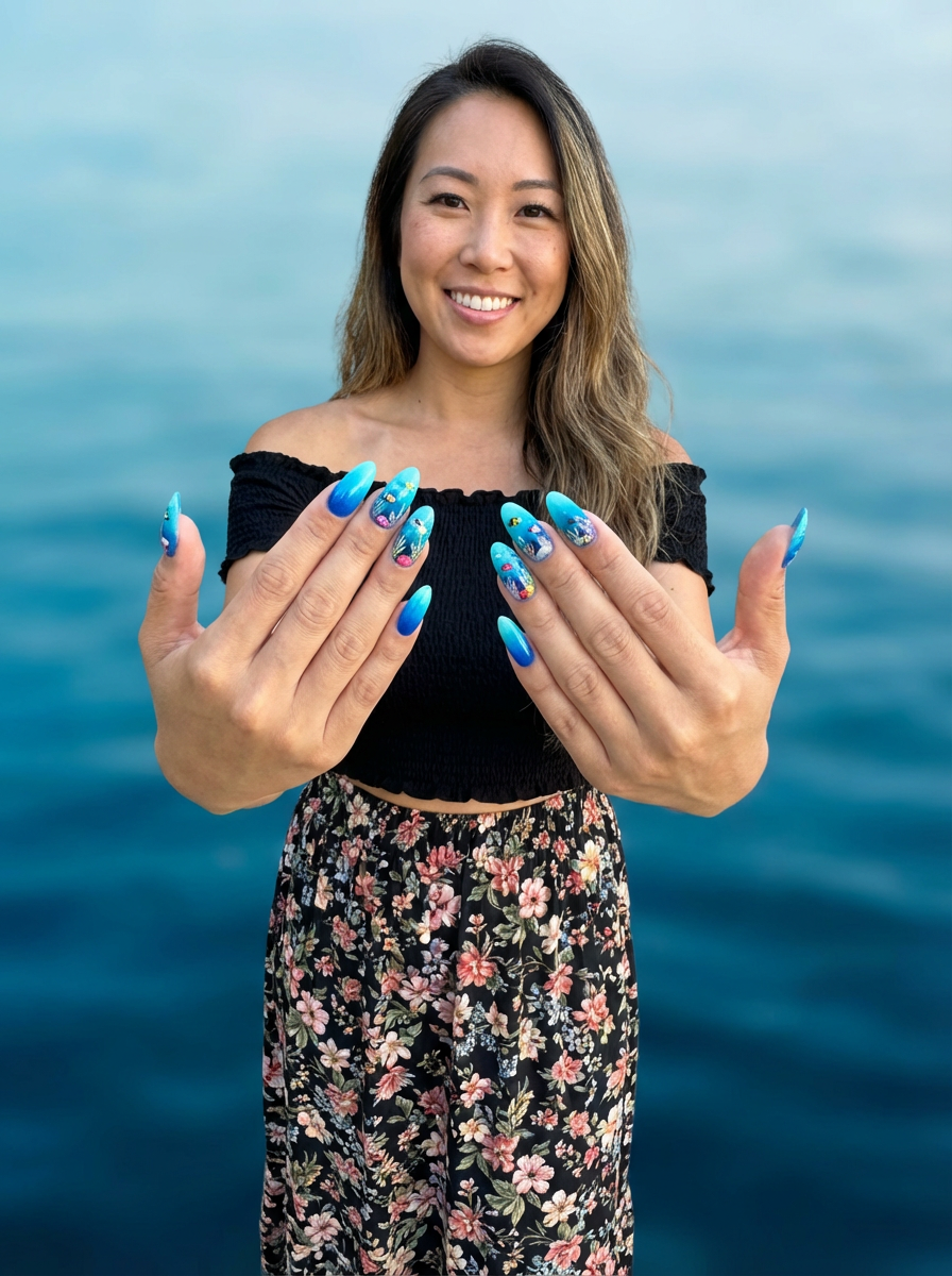 nails with underwater ocean scene featuring tiny sea creatures, vibrant blue ombré background, trendy and bold hand styling