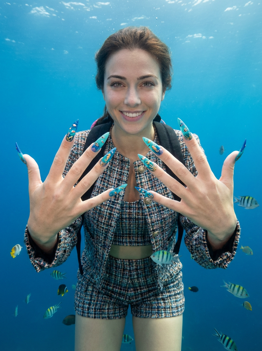nails with underwater ocean scene featuring tiny sea creatures, vibrant blue ombré background, trendy and bold hand styling