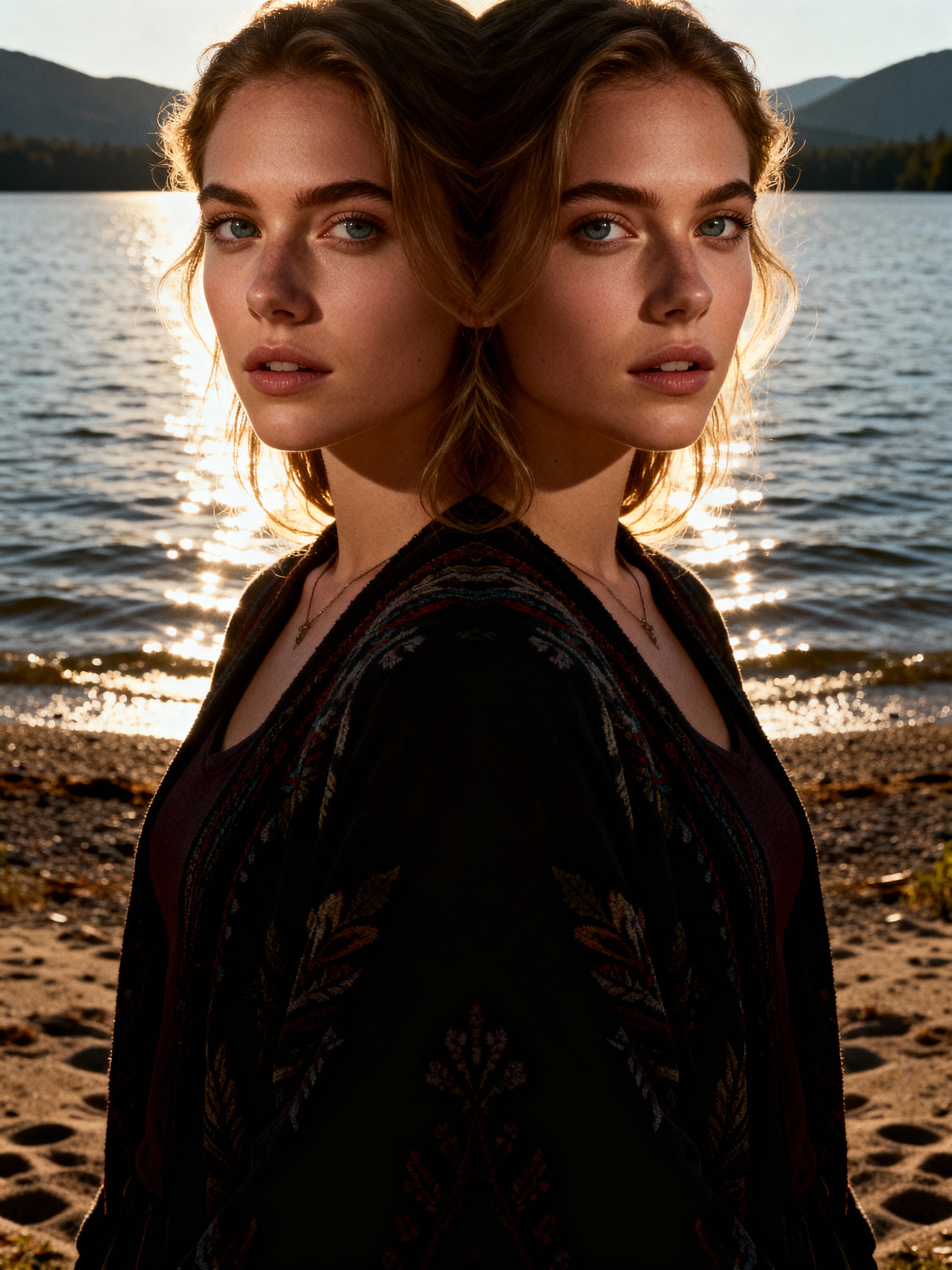 nature-loving feminine model posing near a peaceful lake or calm beach shore