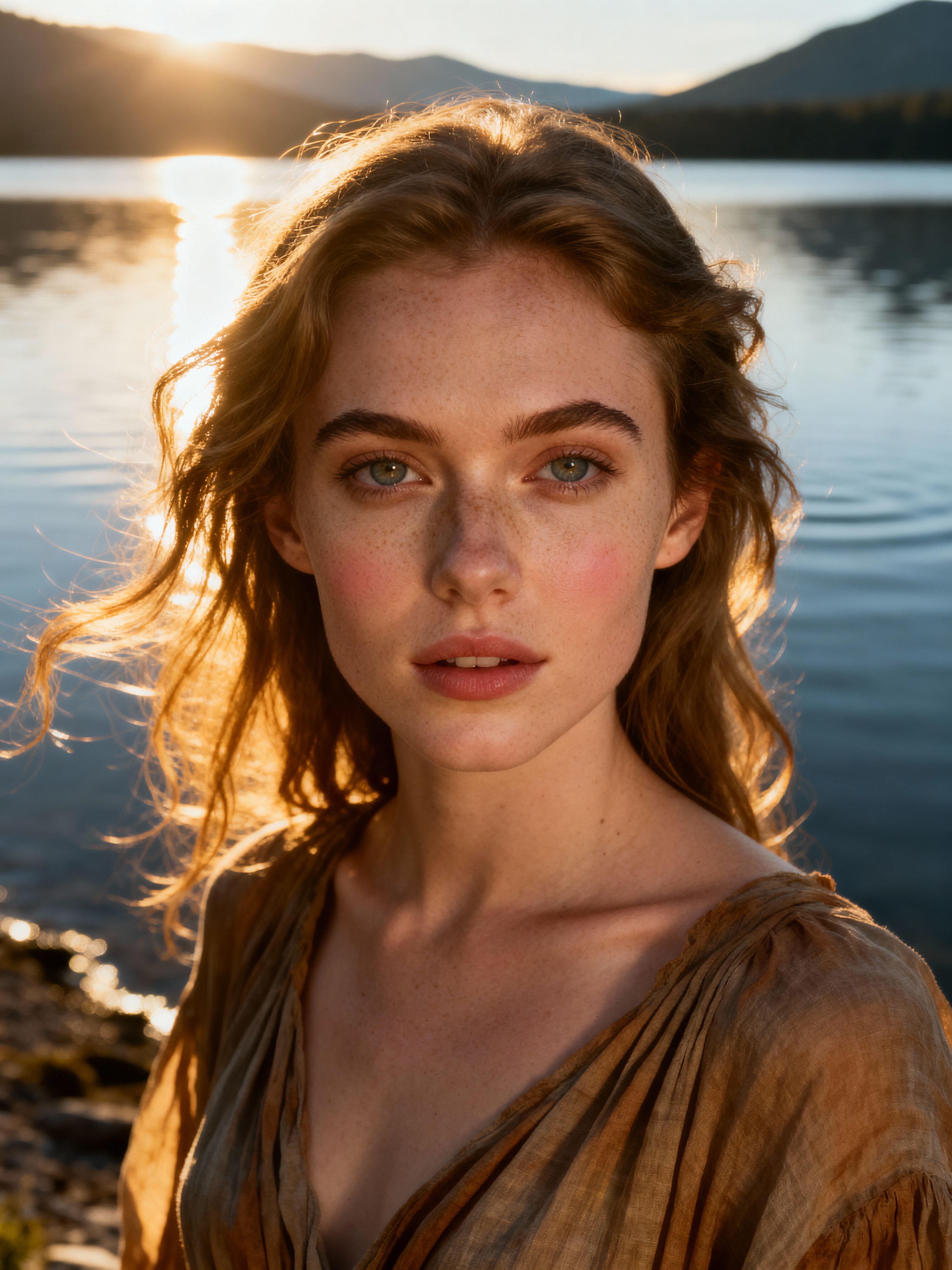 nature-loving feminine model posing near a peaceful lake or calm beach shore