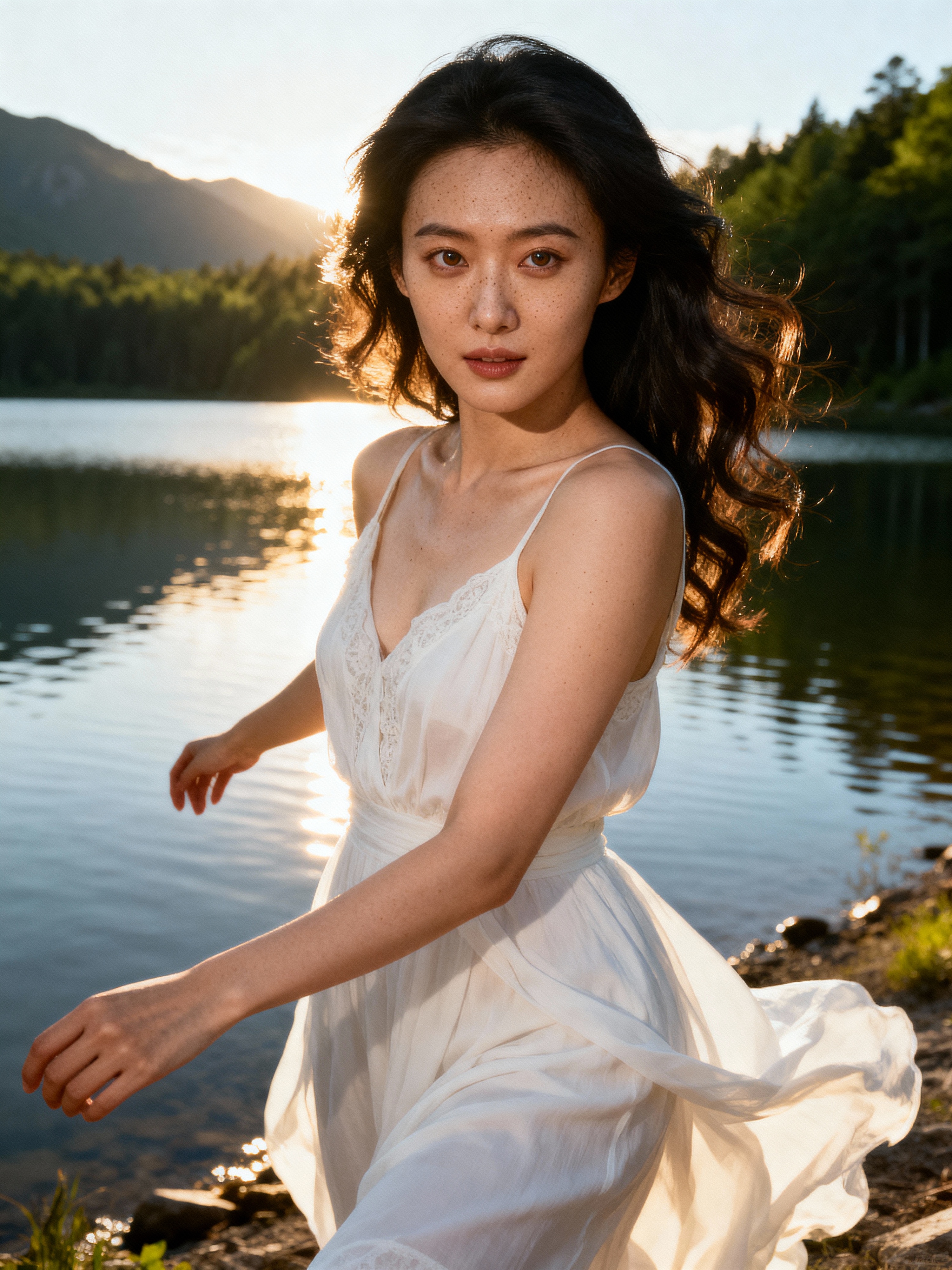 nature-loving feminine model posing near a peaceful lake or calm beach shore