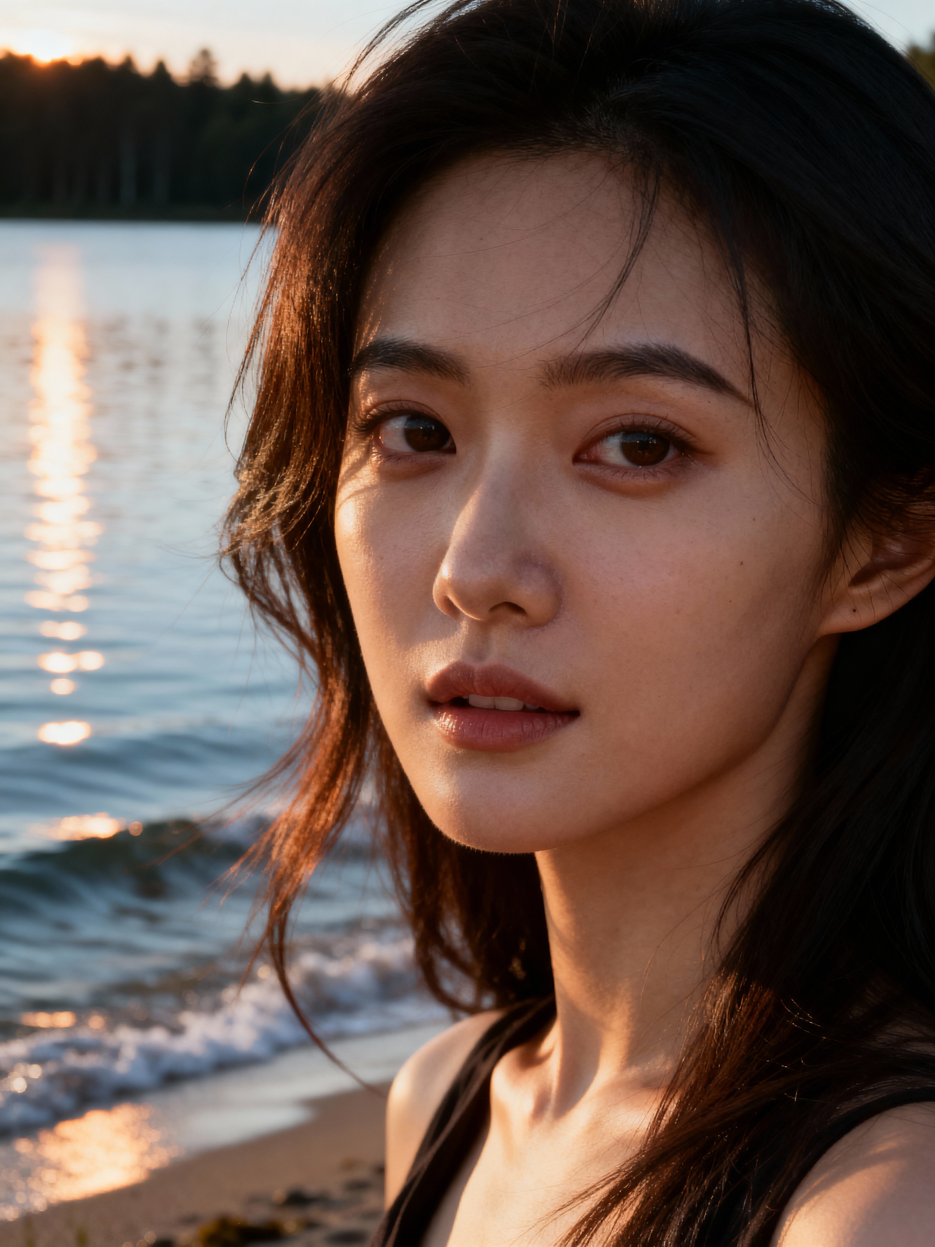 nature-loving feminine model posing near a peaceful lake or calm beach shore