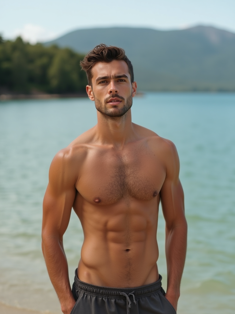 nature-loving masculine model posing near a peaceful lake or calm beach shore