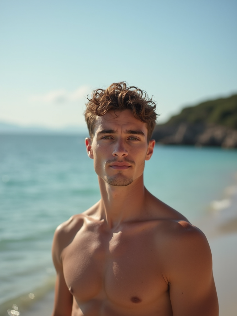 nature-loving masculine model posing near a peaceful lake or calm beach shore