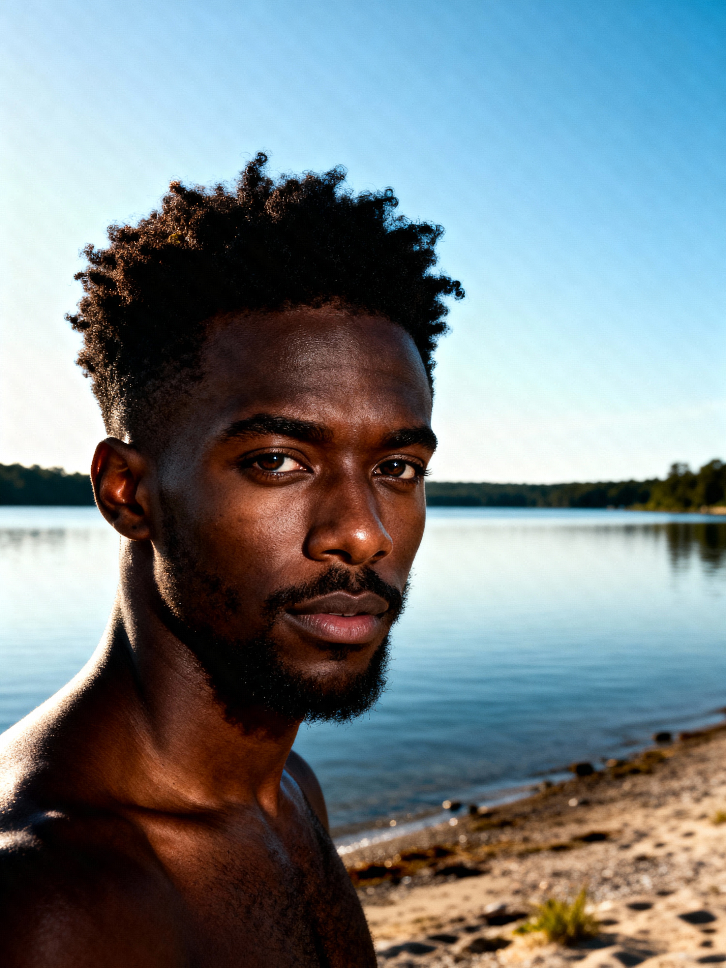 nature-loving masculine model posing near a peaceful lake or calm beach shore