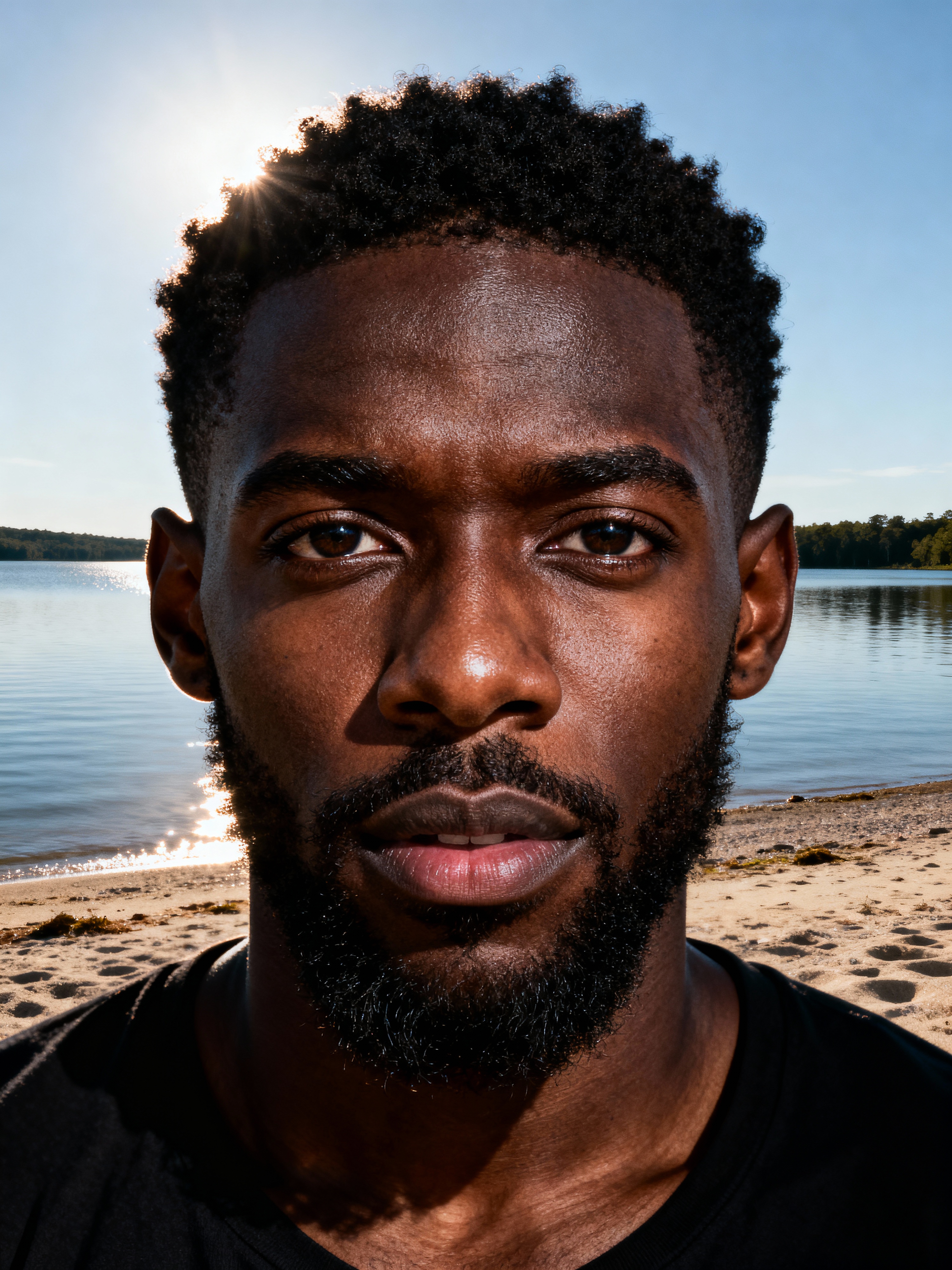 nature-loving masculine model posing near a peaceful lake or calm beach shore