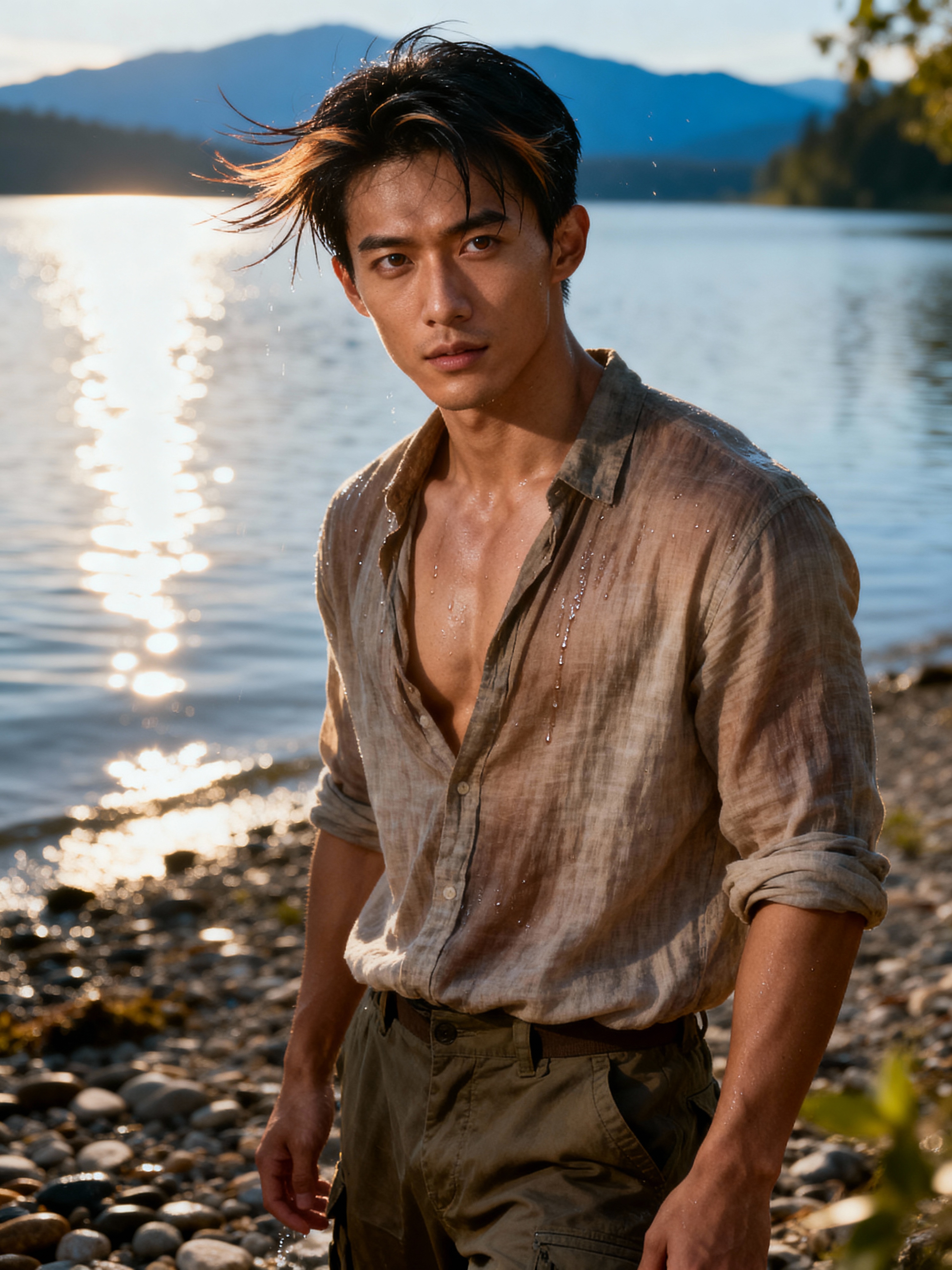 nature-loving masculine model posing near a peaceful lake or calm beach shore