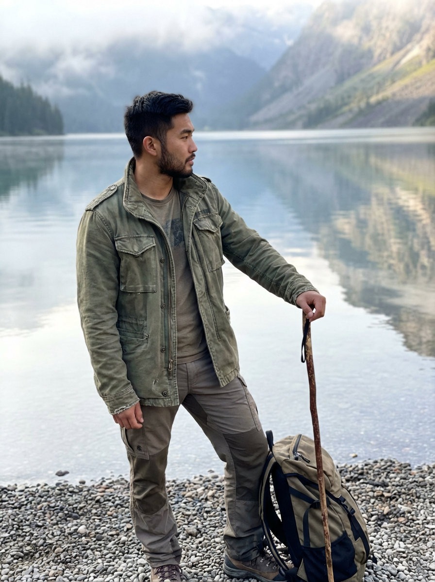 nature-loving masculine model posing near a peaceful lake or calm beach shore