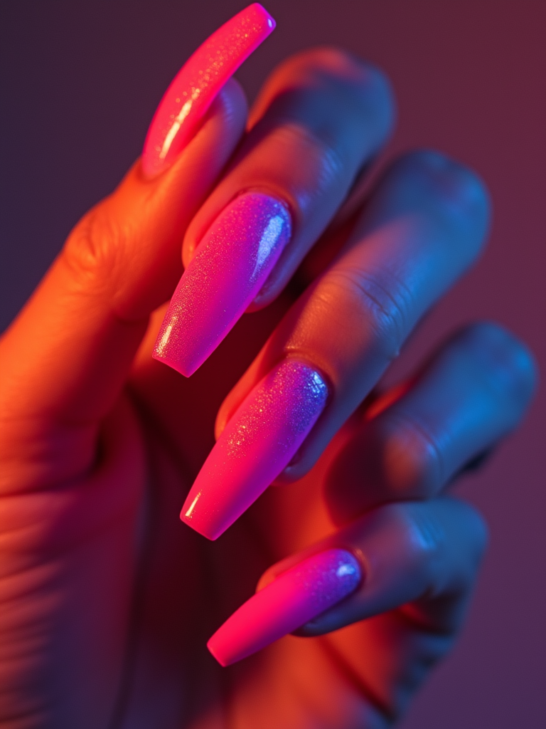neon ombré coffin nails, vibrant color gradient, high saturation studio lighting, trendy and bold hand styling, beauty editorial quality