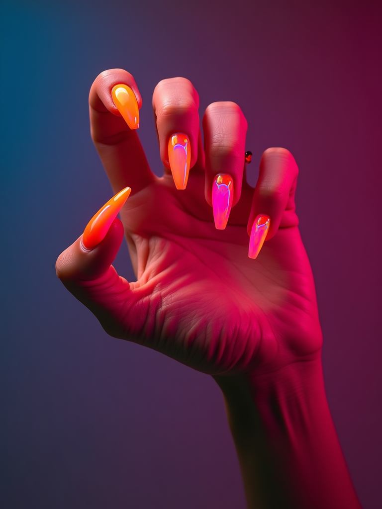 neon ombré coffin nails, vibrant color gradient, high saturation studio lighting, trendy and bold hand styling, beauty editorial quality