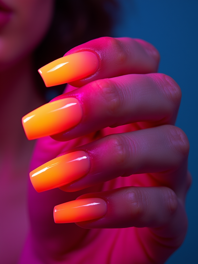 neon ombré coffin nails, vibrant color gradient, high saturation studio lighting, trendy and bold hand styling, beauty editorial quality