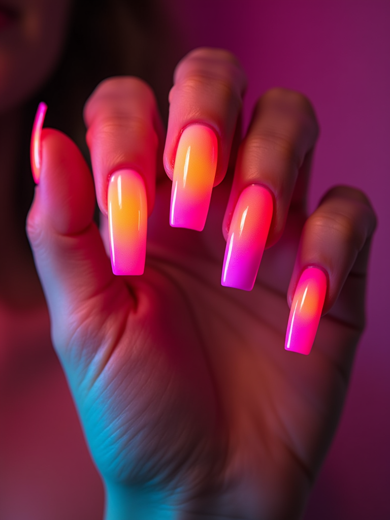 neon ombré coffin nails, vibrant color gradient, high saturation studio lighting, trendy and bold hand styling, beauty editorial quality