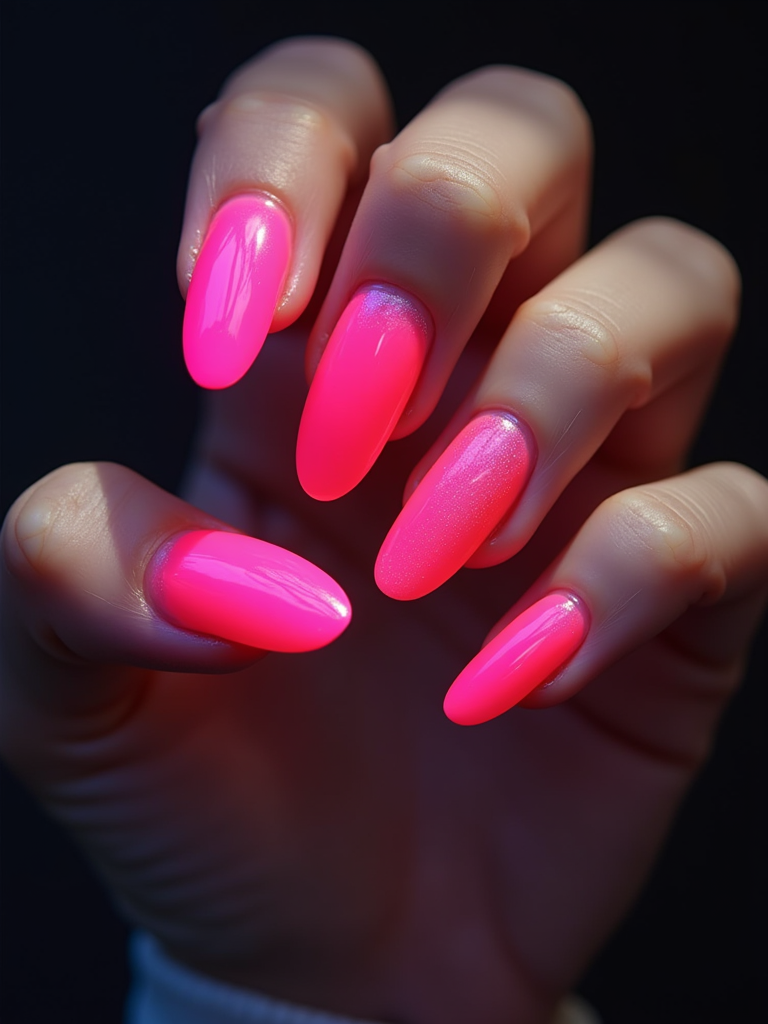 neon ombré coffin nails, vibrant color gradient, high saturation studio lighting, trendy and bold hand styling, beauty editorial quality
