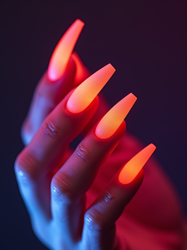 neon ombré coffin nails, vibrant color gradient, high saturation studio lighting, trendy and bold hand styling, beauty editorial quality