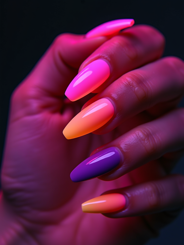 neon ombré coffin nails, vibrant color gradient, high saturation studio lighting, trendy and bold hand styling, beauty editorial quality