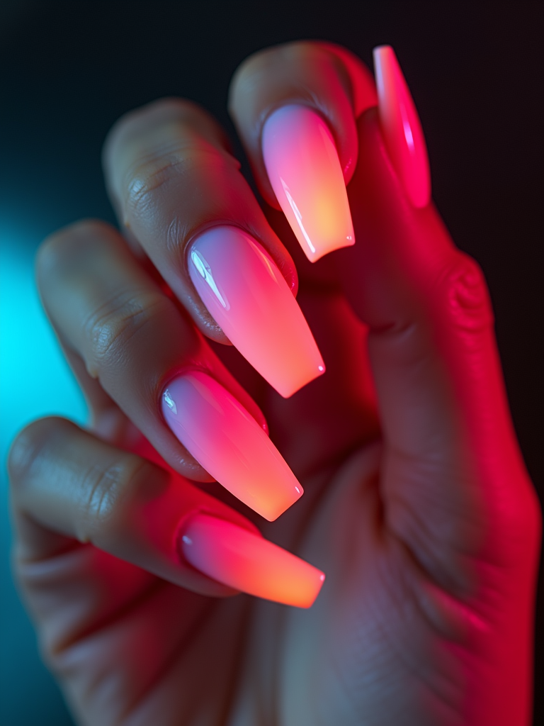 neon ombré coffin nails, vibrant color gradient, high saturation studio lighting, trendy and bold hand styling, beauty editorial quality