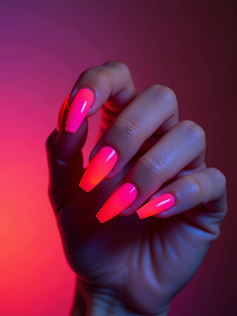neon ombré coffin nails, vibrant color gradient, high saturation studio lighting, trendy and bold hand styling, beauty editorial quality