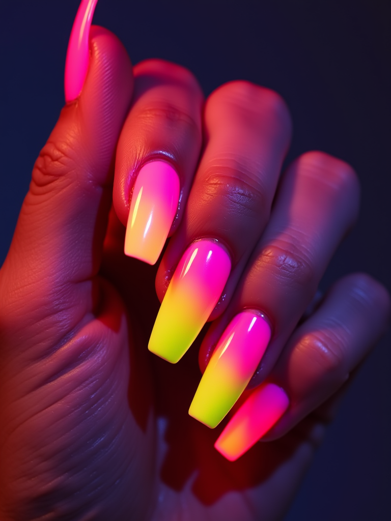 neon ombré coffin nails, vibrant color gradient, high saturation studio lighting, trendy and bold hand styling, beauty editorial quality