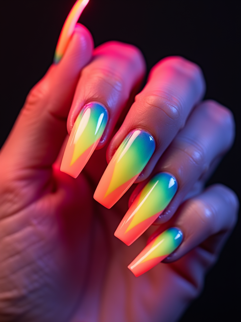 neon ombré coffin nails, vibrant color gradient, high saturation studio lighting, trendy and bold hand styling, beauty editorial quality