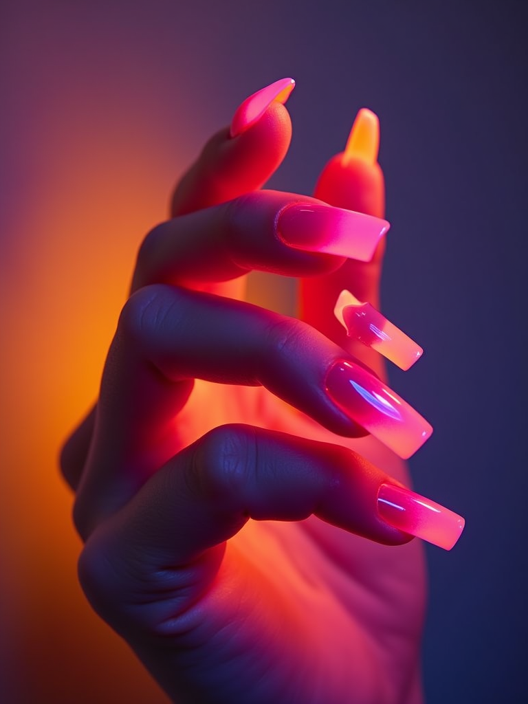 neon ombré coffin nails, vibrant color gradient, high saturation studio lighting, trendy and bold hand styling, beauty editorial quality