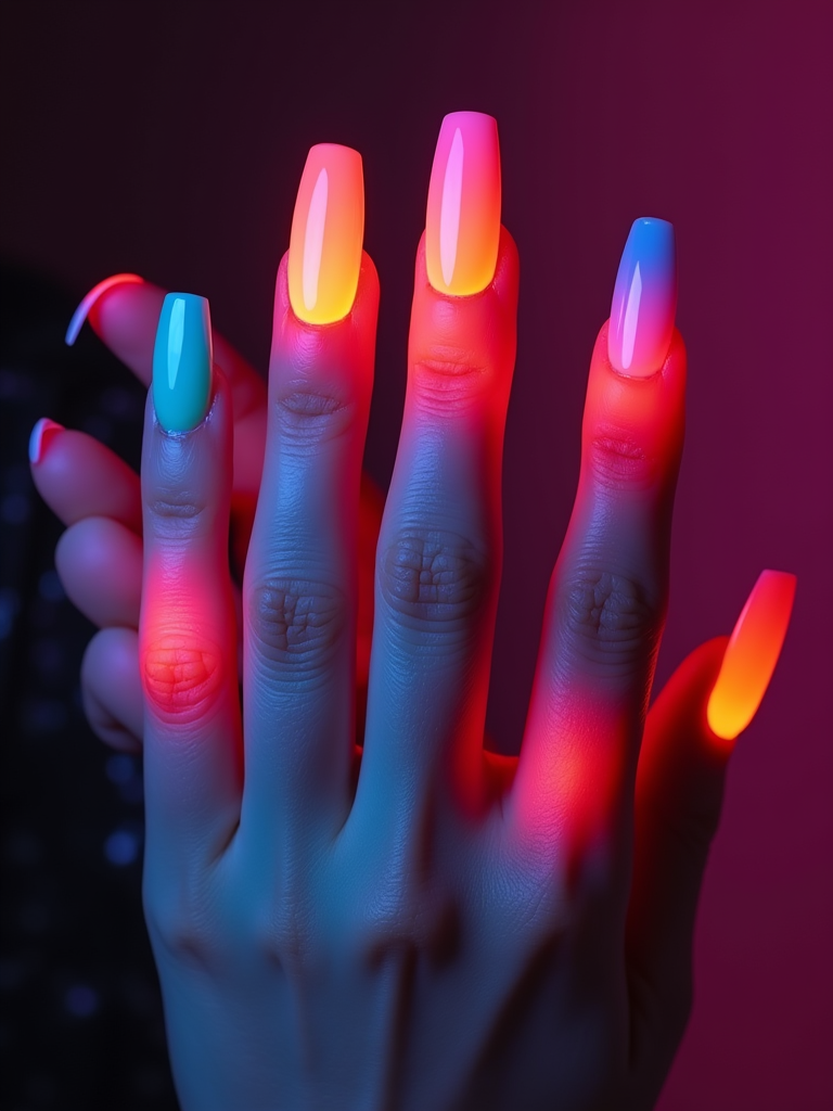 neon ombré coffin nails, vibrant color gradient, high saturation studio lighting, trendy and bold hand styling, beauty editorial quality