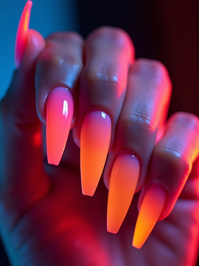 neon ombré coffin nails, vibrant color gradient, high saturation studio lighting, trendy and bold hand styling, beauty editorial quality