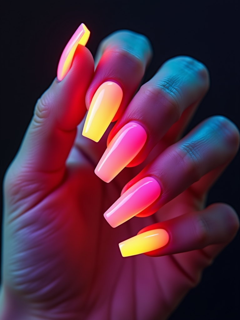 neon ombré coffin nails, vibrant color gradient, high saturation studio lighting, trendy and bold hand styling, beauty editorial quality