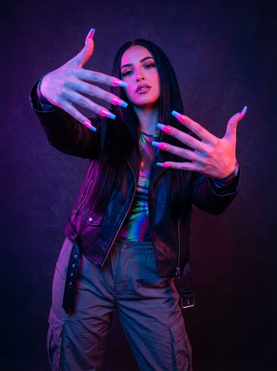 neon ombré coffin nails, vibrant color gradient, high saturation studio lighting, trendy and bold hand styling, beauty editorial quality