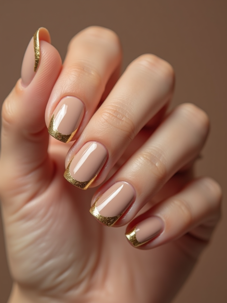 nude base nails with gold foil accents, macro shot, soft focus background, elegant hand pose, editorial-quality beauty photography, luxury vibe