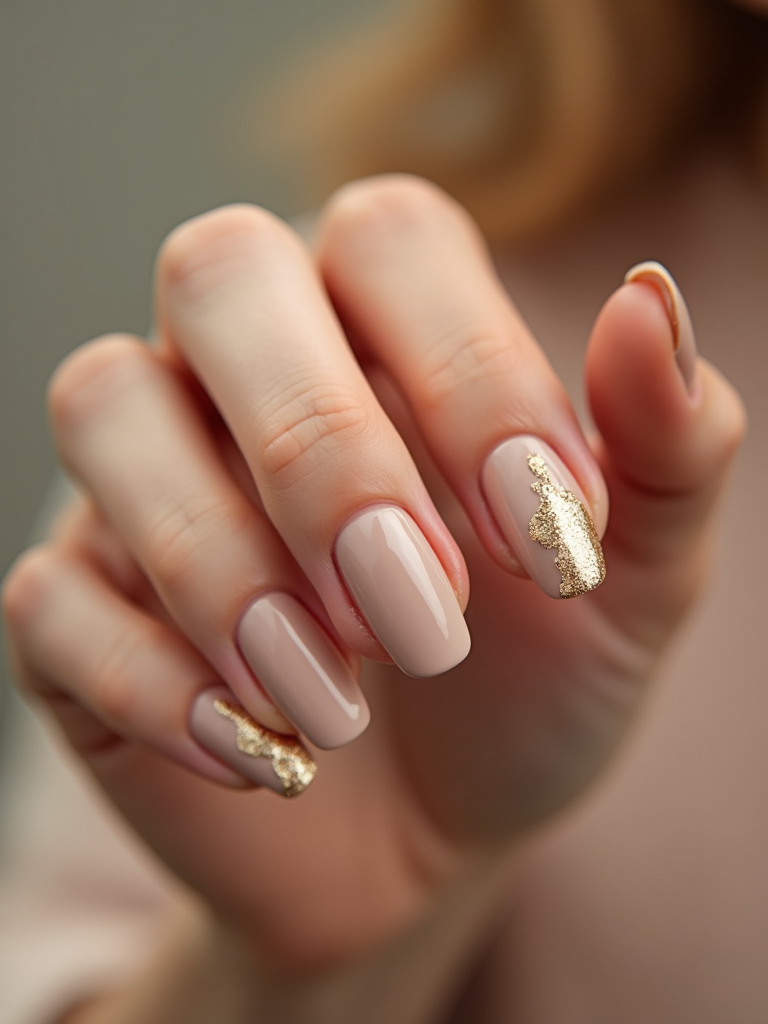 nude base nails with gold foil accents, macro shot, soft focus background, elegant hand pose, editorial-quality beauty photography, luxury vibe