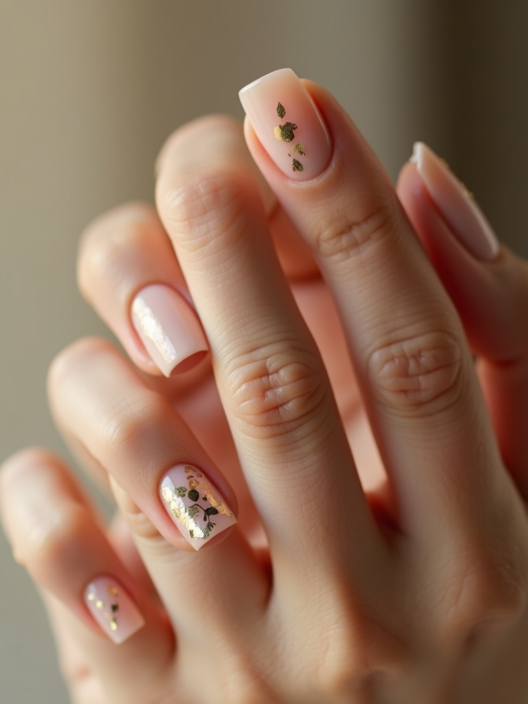 nude base nails with gold foil accents, macro shot, soft focus background, elegant hand pose, editorial-quality beauty photography, luxury vibe