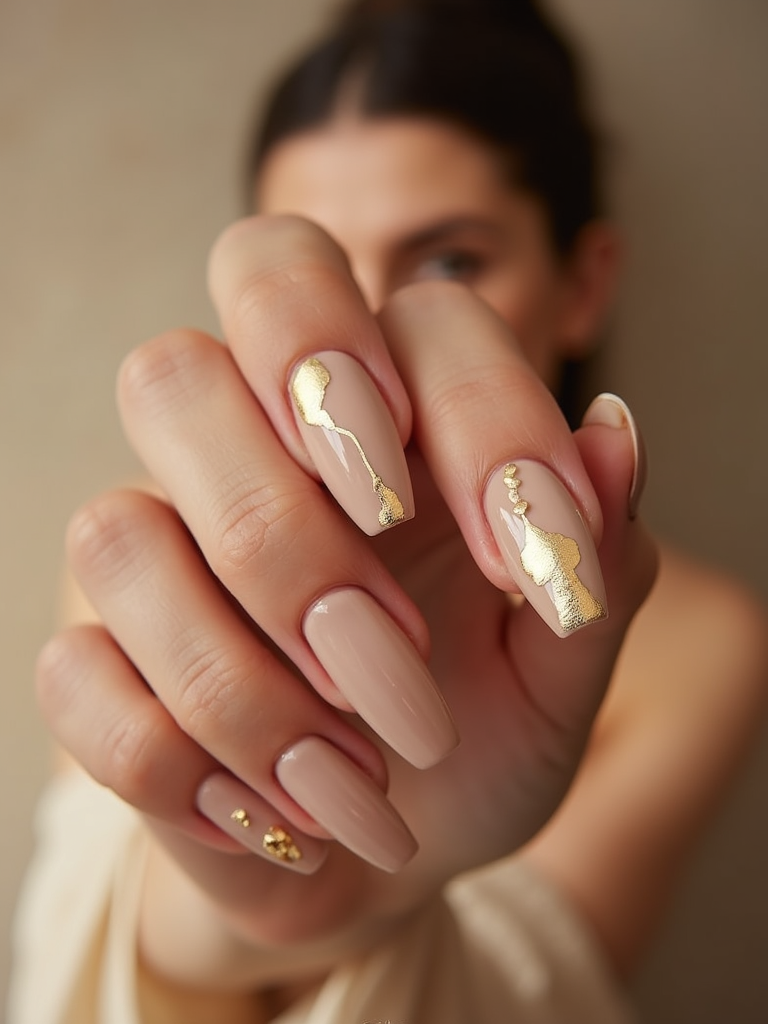 nude base nails with gold foil accents, macro shot, soft focus background, elegant hand pose, editorial-quality beauty photography, luxury vibe