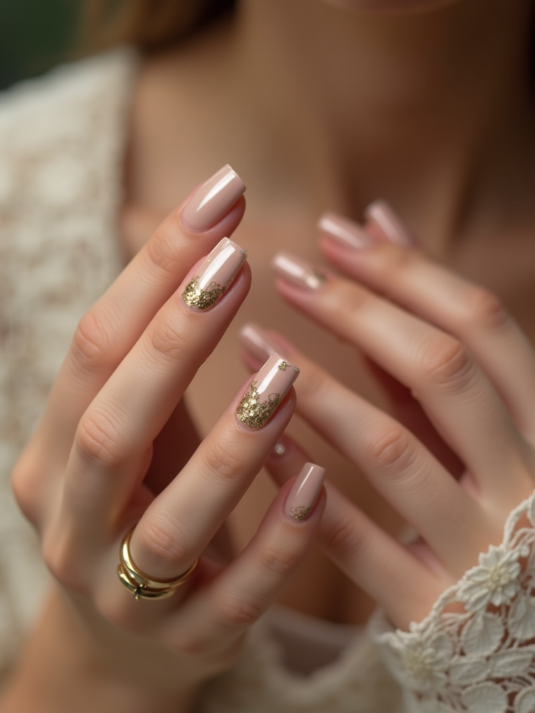 nude base nails with gold foil accents, macro shot, soft focus background, elegant hand pose, editorial-quality beauty photography, luxury vibe