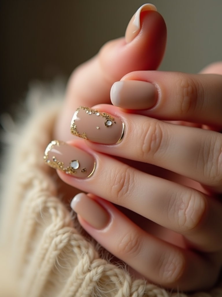 nude base nails with gold foil accents, macro shot, soft focus background, elegant hand pose, editorial-quality beauty photography, luxury vibe