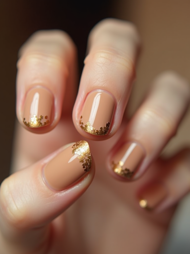 nude base nails with gold foil accents, macro shot, soft focus background, elegant hand pose, editorial-quality beauty photography, luxury vibe