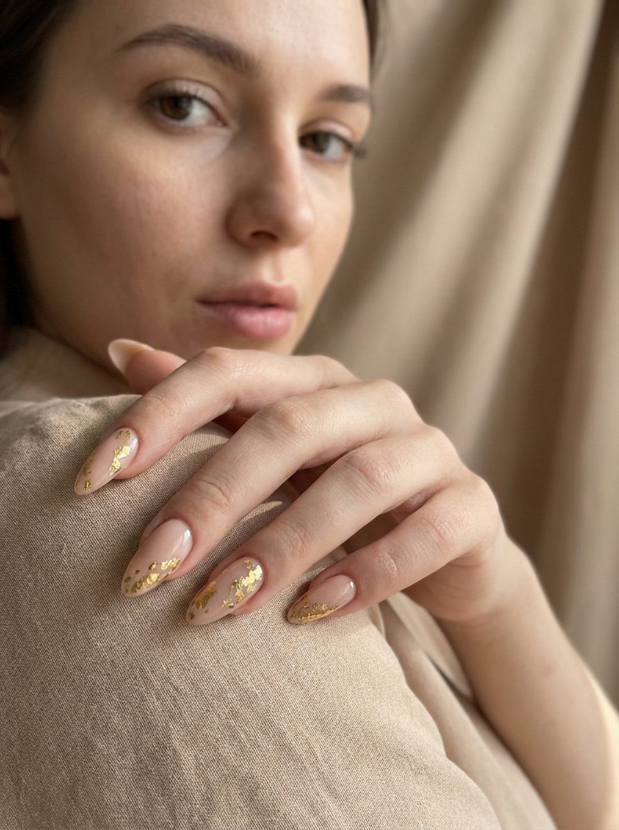 nude base nails with gold foil accents, macro shot, soft focus background, elegant hand pose, editorial-quality beauty photography, luxury vibe