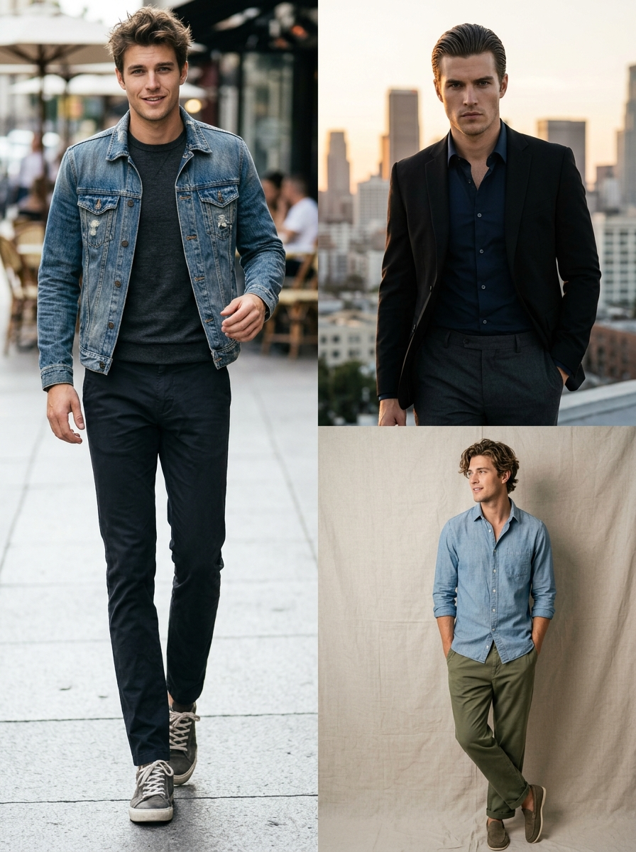 {"Objective": "A high-quality 3-panel vertical split image showing one young model in three different fashion styles and poses to create a versatile 'impressive' look.", "Subject": {"Gender": "male", "Age_Group": "Young Adult (Early 20s)", "Appearance": {"Eyes": "Expressive, clear, with a confident gaze", "Skin": {"Texture": "Natural skin texture, soft glow", "Details": "Clean, healthy complexion", "Makeup": "well-groomed appearance with light stubble; panel 1: natural, panel 2: bold natural features, panel 3: sun-kissed"}, "Hair": {"Style": "Panel 1: Messy styled hair; Panel 2: Sleek straight; Panel 3: Tousled beach waves", "Details": "Shiny, healthy hair with realistic movement"}, "Expression": "A mix of a confident smirk, a serious intense look, and a relaxed sideways glance"}}, "Wardrobe": {"Clothing": "Panel 1: Casual denim jacket over a fitted shirt and trousers; Panel 2: Elegant fitted shirt and trousers; Panel 3: Boho-chic chambray shirt and wide-leg trousers", "Style": "Trendy, high-fashion, and versatile"}, "Lighting": {"Type": "Panel 1: Bright daylight; Panel 2: Cinematic golden hour; Panel 3: Soft studio lighting", "Quality": ["Natural highlighting", "Depth-enhancing shadows"]}, "Camera_and_Technical": {"Camera_Style": "Professional Editorial Photography", "Lens": "35mm for wide environmental shots", "Aperture": "f/2.8", "Focus": "Sharp focus on the subject", "Depth_of_Field": "Shallow background blur (bokeh) to make the subject pop"}, "Visual_Style": {"Aesthetic": "Modern Fashion Magazine Spread", "Resolution": "8k, highly detailed", "Color_Grading": {"Palette": ["Vibrant and warm", "Deep contrasts"], "Style": "Clean, polished, and commercial"}}}}