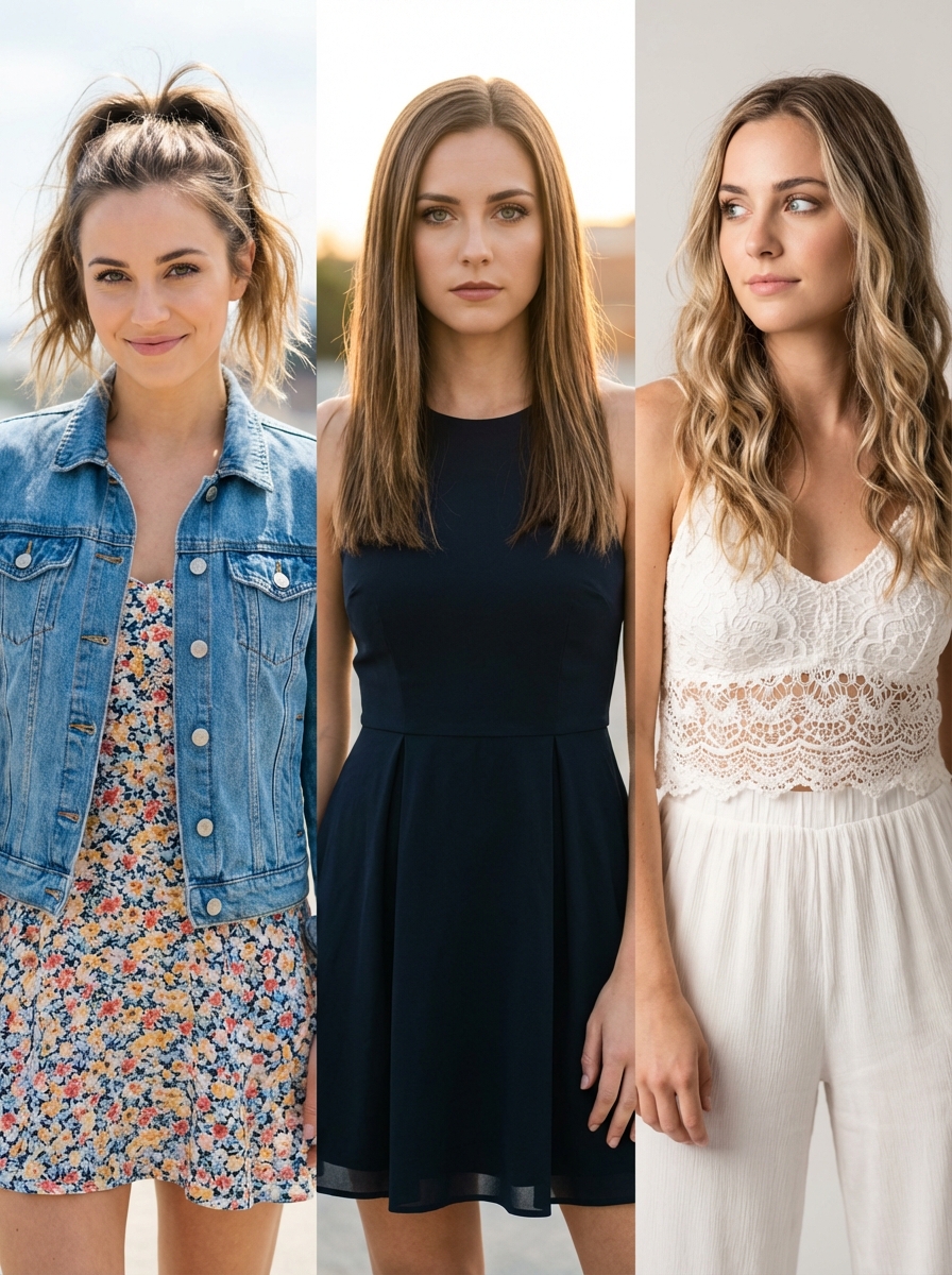 {"Objective": "A high-quality 3-panel vertical split image showing one young model in three different fashion styles and poses to create a versatile 'impressive' look.", "Subject": {"Gender": "model", "Age_Group": "Young Adult (Early 20s)", "Appearance": {"Eyes": "Expressive, clear, with a confident gaze", "Skin": {"Texture": "Natural skin texture, soft glow", "Details": "Clean, healthy complexion", "Makeup": "Soft glam ; panel 1: natural, panel 2: bold lipstick , panel 3: sun-kissed"}, "Hair": {"Style": "Panel 1: Messy ponytail ; Panel 2: Sleek straight; Panel 3: Loose beach waves", "Details": "Shiny, healthy hair with realistic movement"}, "Expression": "A mix of a playful smile, a confident serious look, and a dreamy sideways glance"}}, "Wardrobe": {"Clothing": "Panel 1: Casual denim jacket over a floral dress ; Panel 2: Elegant cocktail dress ; Panel 3: Boho-chic lace top and wide-leg trousers", "Style": "Trendy, high-fashion, and versatile"}, "Lighting": {"Type": "Panel 1: Bright daylight; Panel 2: Cinematic golden hour; Panel 3: Soft studio lighting", "Quality": ["Natural highlighting", "Depth-enhancing shadows"]}, "Camera_and_Technical": {"Camera_Style": "Professional Editorial Photography", "Lens": "35mm for wide environmental shots", "Aperture": "f/2.8", "Focus": "Sharp focus on the subject", "Depth_of_Field": "Shallow background blur (bokeh) to make the subject pop"}, "Visual_Style": {"Aesthetic": "Modern Fashion Magazine Spread", "Resolution": "8k, highly detailed", "Color_Grading": {"Palette": ["Vibrant and warm", "Deep contrasts"], "Style": "Clean, polished, and commercial"}}}