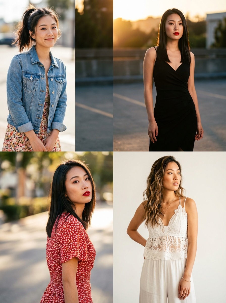 {"Objective": "A high-quality 3-panel vertical split image showing one young model in three different fashion styles and poses to create a versatile 'impressive' look.", "Subject": {"Gender": "model", "Age_Group": "Young Adult (Early 20s)", "Appearance": {"Eyes": "Expressive, clear, with a confident gaze", "Skin": {"Texture": "Natural skin texture, soft glow", "Details": "Clean, healthy complexion", "Makeup": "Soft glam ; panel 1: natural, panel 2: bold lipstick , panel 3: sun-kissed"}, "Hair": {"Style": "Panel 1: Messy ponytail ; Panel 2: Sleek straight; Panel 3: Loose beach waves", "Details": "Shiny, healthy hair with realistic movement"}, "Expression": "A mix of a playful smile, a confident serious look, and a dreamy sideways glance"}}, "Wardrobe": {"Clothing": "Panel 1: Casual denim jacket over a floral dress ; Panel 2: Elegant cocktail dress ; Panel 3: Boho-chic lace top and wide-leg trousers", "Style": "Trendy, high-fashion, and versatile"}, "Lighting": {"Type": "Panel 1: Bright daylight; Panel 2: Cinematic golden hour; Panel 3: Soft studio lighting", "Quality": ["Natural highlighting", "Depth-enhancing shadows"]}, "Camera_and_Technical": {"Camera_Style": "Professional Editorial Photography", "Lens": "35mm for wide environmental shots", "Aperture": "f/2.8", "Focus": "Sharp focus on the subject", "Depth_of_Field": "Shallow background blur (bokeh) to make the subject pop"}, "Visual_Style": {"Aesthetic": "Modern Fashion Magazine Spread", "Resolution": "8k, highly detailed", "Color_Grading": {"Palette": ["Vibrant and warm", "Deep contrasts"], "Style": "Clean, polished, and commercial"}}}