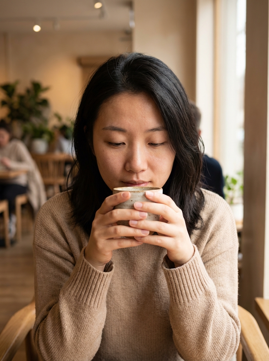 {"Objective": "Create a natural, ultra-realistic cinematic café portrait that captures a quiet, introspective candid moment with warm, comforting atmosphere.", "Persona_Details": {"Subject": "Young adult model", "Expression_and_Emotion": {"Expression": "Calm, introspective", "Gaze": "Eyes softly focused downward", "Mood": "Peaceful, reflective, intimate"}, "Pose_and_Action": {"Action": "Gently holding a small ceramic cup with both hands", "Moment": "Mid-sip, cup close to her lips", "Body_Language": "Relaxed, natural, unposed"}, "Appearance": {"Makeup": "Minimal, natural makeup", "Hair": "Naturally styled, effortless", "Skin": "Natural texture with soft highlights"}}, "Wardrobe": {"Outfit": "Simple, elegant clothing in neutral tones", "Style": "Timeless, cozy café fashion"}, "Scene_and_Environment": {"Location": "Cozy indoor café", "Background": {"Elements": ["Warm interior tones", "Subtle café textures"], "Treatment": "Softly blurred, non-distracting"}, "Atmosphere": "Quiet, warm, comforting, lived-in"}, "Lighting_and_Mood": {"Light_Source": "Natural daylight from a large glass window on the right", "Lighting_Quality": "Soft, diffused, gentle", "Highlights": "Delicate highlights on face and hands", "Shadows": "Soft, natural shadows adding depth", "Mood": "Warm, intimate, contemplative"}, "Photography_Style": {"Genre": "Candid lifestyle portrait", "Aesthetic": "Cinematic, natural realism", "Lens": "50mm or 85mm", "Aperture": "f/1.8–f/2.0", "Depth_of_Field": "Shallow depth of field isolating the subject", "Framing": "Medium-close portrait"}, "Color_and_Grading": {"Palette": ["Warm neutrals", "Soft browns", "Creamy whites", "Natural skin tones"], "Grading": "Subtle cinematic color grading with warm highlights and soft contrast"}, "Detail_and_Quality": {"Texture_Detail": ["Ceramic cup surface", "Natural skin micro-texture", "Fabric folds in clothing"], "Resolution": "High resolution", "Realism": "Photorealistic, professional photography quality"}, "Quality_Tags": ["Ultra-realistic", "Photorealism", "Candid café portrait", "Lifestyle photography", "Warm cinematic lighting", "Emotional realism"], "Negative_Prompts": ["Text", "Logo", "Watermark", "Harsh lighting", "Over-posed look", "Cartoon or illustration style", "Low resolution", "Over-retouched skin"], "Output_Constraints": {"Text_Overlay": false, "Branding": false, "Watermark": false}, "Response_Format": {"Type": "Single image", "Aspect_Ratio": "3:4 or 4:5 recommended", "Use_Case": "Lifestyle editorial, cinematic storytelling, café branding imagery"}}
