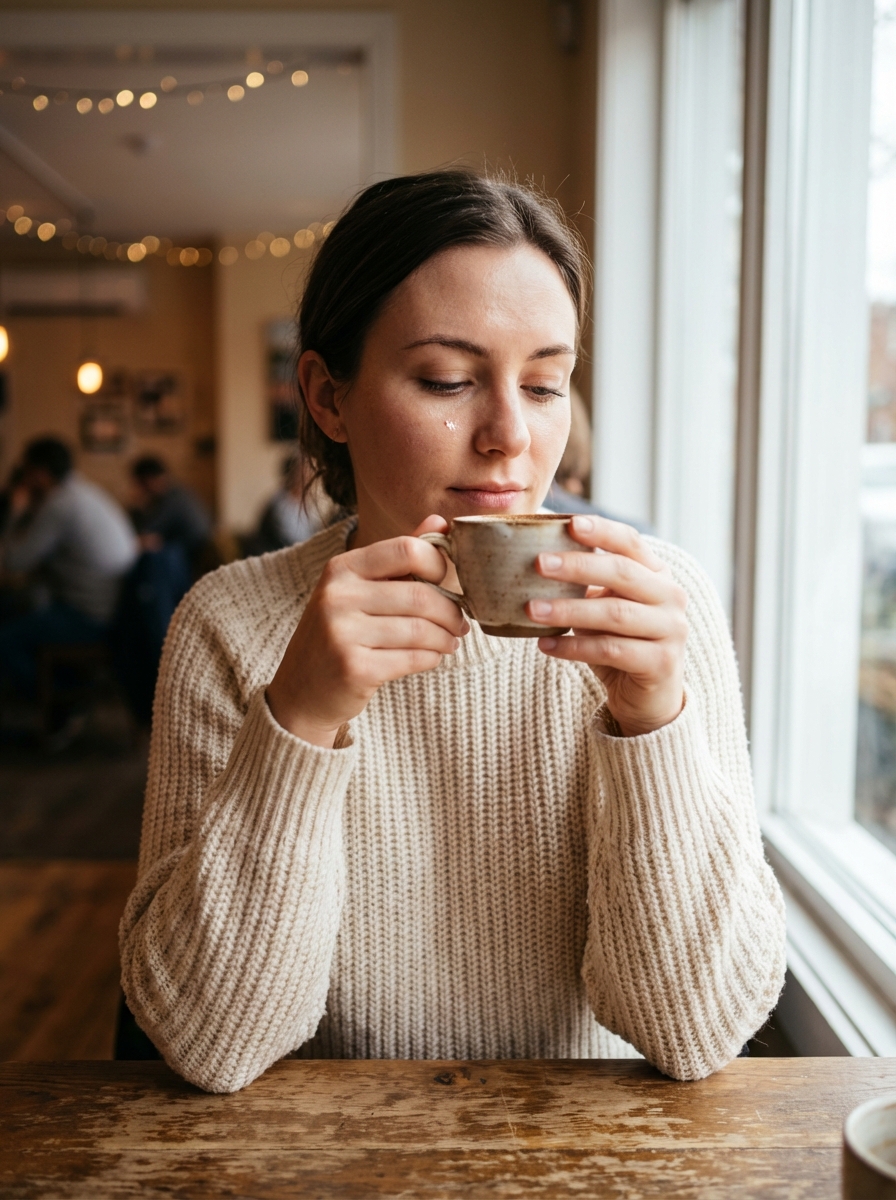 {"Objective": "Create a natural, ultra-realistic cinematic café portrait that captures a quiet, introspective candid moment with warm, comforting atmosphere.", "Persona_Details": {"Subject": "Young adult model", "Expression_and_Emotion": {"Expression": "Calm, introspective", "Gaze": "Eyes softly focused downward", "Mood": "Peaceful, reflective, intimate"}, "Pose_and_Action": {"Action": "Gently holding a small ceramic cup with both hands", "Moment": "Mid-sip, cup close to her lips", "Body_Language": "Relaxed, natural, unposed"}, "Appearance": {"Makeup": "Minimal, natural makeup", "Hair": "Naturally styled, effortless", "Skin": "Natural texture with soft highlights"}}, "Wardrobe": {"Outfit": "Simple, elegant clothing in neutral tones", "Style": "Timeless, cozy café fashion"}, "Scene_and_Environment": {"Location": "Cozy indoor café", "Background": {"Elements": ["Warm interior tones", "Subtle café textures"], "Treatment": "Softly blurred, non-distracting"}, "Atmosphere": "Quiet, warm, comforting, lived-in"}, "Lighting_and_Mood": {"Light_Source": "Natural daylight from a large glass window on the right", "Lighting_Quality": "Soft, diffused, gentle", "Highlights": "Delicate highlights on face and hands", "Shadows": "Soft, natural shadows adding depth", "Mood": "Warm, intimate, contemplative"}, "Photography_Style": {"Genre": "Candid lifestyle portrait", "Aesthetic": "Cinematic, natural realism", "Lens": "50mm or 85mm", "Aperture": "f/1.8–f/2.0", "Depth_of_Field": "Shallow depth of field isolating the subject", "Framing": "Medium-close portrait"}, "Color_and_Grading": {"Palette": ["Warm neutrals", "Soft browns", "Creamy whites", "Natural skin tones"], "Grading": "Subtle cinematic color grading with warm highlights and soft contrast"}, "Detail_and_Quality": {"Texture_Detail": ["Ceramic cup surface", "Natural skin micro-texture", "Fabric folds in clothing"], "Resolution": "High resolution", "Realism": "Photorealistic, professional photography quality"}, "Quality_Tags": ["Ultra-realistic", "Photorealism", "Candid café portrait", "Lifestyle photography", "Warm cinematic lighting", "Emotional realism"], "Negative_Prompts": ["Text", "Logo", "Watermark", "Harsh lighting", "Over-posed look", "Cartoon or illustration style", "Low resolution", "Over-retouched skin"], "Output_Constraints": {"Text_Overlay": false, "Branding": false, "Watermark": false}, "Response_Format": {"Type": "Single image", "Aspect_Ratio": "3:4 or 4:5 recommended", "Use_Case": "Lifestyle editorial, cinematic storytelling, café branding imagery"}}