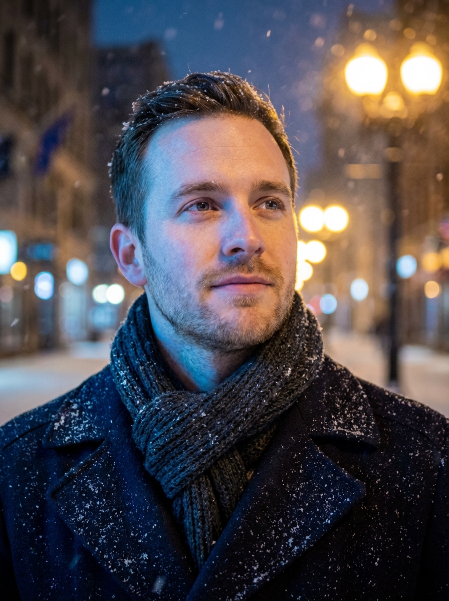 {"Objective": "Create an ultra-realistic cinematic close-up winter portrait with a moody urban atmosphere, balancing cool winter tones and warm city light.", "Persona_Details": {"Subject": "Young adult model", "Facial_Features": {"Facial_Hair": "Light stubble", "Expression": "Calm, thoughtful", "Gaze": "Looking slightly upward"}, "Appearance_Interaction": {"Snow": "Soft snowflakes settling naturally on hair, scarf, and coat"}}, "Wardrobe": {"Outerwear": "Dark winter overcoat", "Accessory": "Thick knitted scarf", "Style": "Classic, understated winter fashion"}, "Scene_and_Environment": {"Location": "Outdoor winter city street at night", "Atmosphere": {"Snowfall": "Gentle, continuous snowfall", "Mood": "Quiet, reflective, cinematic"}, "Background": {"Lighting": "Warm golden street lamps", "Effect": "Soft circular bokeh highlights"}}, "Lighting_and_Mood": {"Key_Light": "Cool blue winter light illuminating the face", "Accent_Light": "Warm golden highlights from street lamps", "Contrast": "Cool-to-warm cinematic balance", "Mood": "Atmospheric, intimate, emotionally reflective"}, "Photography_Style": {"Genre": "Cinematic urban portrait", "Lens": "85mm", "Aperture": "f/1.8", "Depth_of_Field": "Shallow depth of field", "Framing": "Close-up portrait", "Focus": "Eyes and facial details razor-sharp with smooth background blur"}, "Color_and_Grading": {"Color_Grade": "Cinematic color grading", "Shadows": "Teal-blue winter tones", "Highlights": "Warm golden accents", "Overall_Palette": ["Cool blues", "Deep neutrals", "Warm amber highlights"]}, "Detail_and_Quality": {"Texture_Detail": ["Realistic skin texture", "Fine stubble detail", "Knitted fabric fibers", "Individual snowflakes"], "Realism_Level": "Photorealistic", "Quality": "Professional photography standard"}, "Quality_Tags": ["Ultra-realistic", "Photorealism", "Cinematic winter portrait", "Urban night atmosphere", "High-end editorial"], "Negative_Prompts": ["Text", "Logo", "Watermark", "Over-smooth skin", "Cartoon or illustration style", "Flat lighting", "Low resolution"], "Output_Constraints": {"Text_Overlay": false, "Branding": false, "Watermark": false}, "Response_Format": {"Type": "Single image", "Aspect_Ratio": "Portrait (4:5 or 3:4 recommended)", "Use_Case": "Cinematic portraiture, winter editorial, lifestyle storytelling"}}