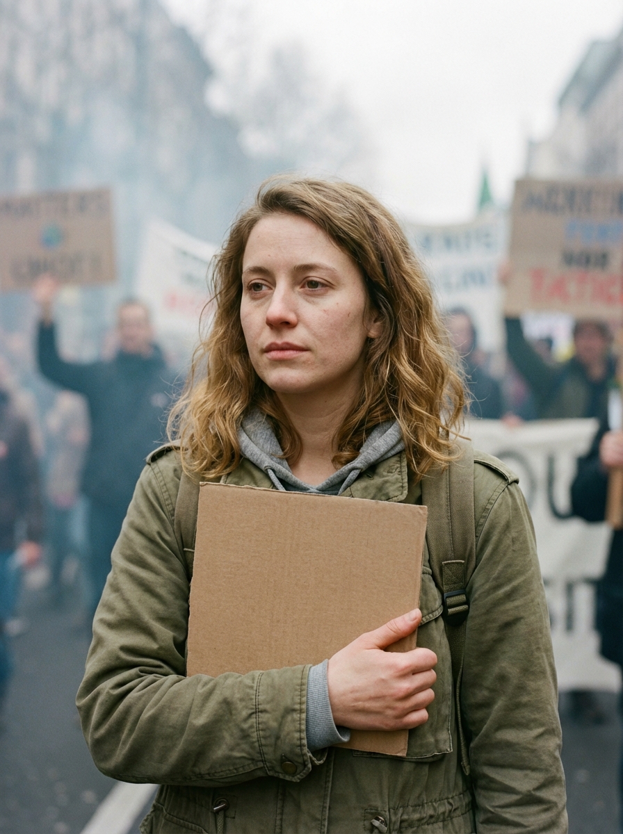 {"Objective": "Create an ultra-realistic cinematic documentary-style portrait capturing emotional resilience and quiet determination within a social movement.", "Persona_Details": {"Subject": "Young adult model", "Expression_and_Emotion": {"Expression": "Slightly tired but determined", "Emotion": "Resilience, resolve, quiet strength"}, "Appearance": {"Hair": "Wavy, shoulder-length hair ", "Makeup": "Natural, minimal", "Overall_Look": "Authentic, unpolished realism"}}, "Wardrobe_and_Props": {"Clothing": {"Outerwear": "Worn olive-green jacket", "Layering": "Hoodie underneath", "Style": "Practical, lived-in, protest-ready"}, "Accessories": {"Backpack": "Worn backpack on shoulders"}, "Prop": {"Item": "Cardboard protest sign", "Detail": "Blank, no text or symbols", "Interaction": "Held close to the body"}}, "Scene_and_Environment": {"Location": "Active protest or social movement setting", "Background": {"Crowd": "Blurred figures with raised placards", "Atmosphere": "Smoky, hazy air suggesting tension and scale"}, "Depth_Cues": "Crowd and signs softly blurred to isolate subject"}, "Lighting_and_Mood": {"Lighting": "Soft diffused overcast daylight", "Contrast": "Low-to-moderate for realism", "Mood": "Somber, emotional, grounded", "Style": "Natural, observational, documentary tone"}, "Photography_Style": {"Genre": "Documentary-style cinematic portrait", "Aesthetic": "Film still realism", "Lens": "50mm", "Aperture": "f/1.8", "Depth_of_Field": "Shallow, subject isolated from background", "Framing": "Waist-up or mid-torso portrait"}, "Color_and_Grading": {"Palette": ["Muted earthy greens", "Soft browns", "Desaturated neutrals", "Subtle skin tones"], "Grading": "Cinematic, slightly desaturated, natural contrast"}, "Detail_and_Quality": {"Texture_Detail": ["Fabric wear on jacket", "Natural skin texture", "Fine hair detail", "Atmospheric smoke"], "Grain": "Subtle film grain", "Realism": "Photorealistic, documentary-level authenticity"}, "Quality_Tags": ["Ultra-realistic", "Photorealism", "Documentary portrait", "Emotional storytelling", "Film still aesthetic", "Social realism"], "Negative_Prompts": ["Text on sign", "Logos", "Watermarks", "Stylized fashion look", "Overly dramatic lighting", "Cartoon or illustration style", "Over-retouched skin"], "Output_Constraints": {"Text_Overlay": false, "Branding": false, "Watermark": false}, "Response_Format": {"Type": "Single image", "Aspect_Ratio": "3:2 or 4:5 recommended", "Use_Case": "Documentary storytelling, cinematic social realism, editorial photojournalism"}}