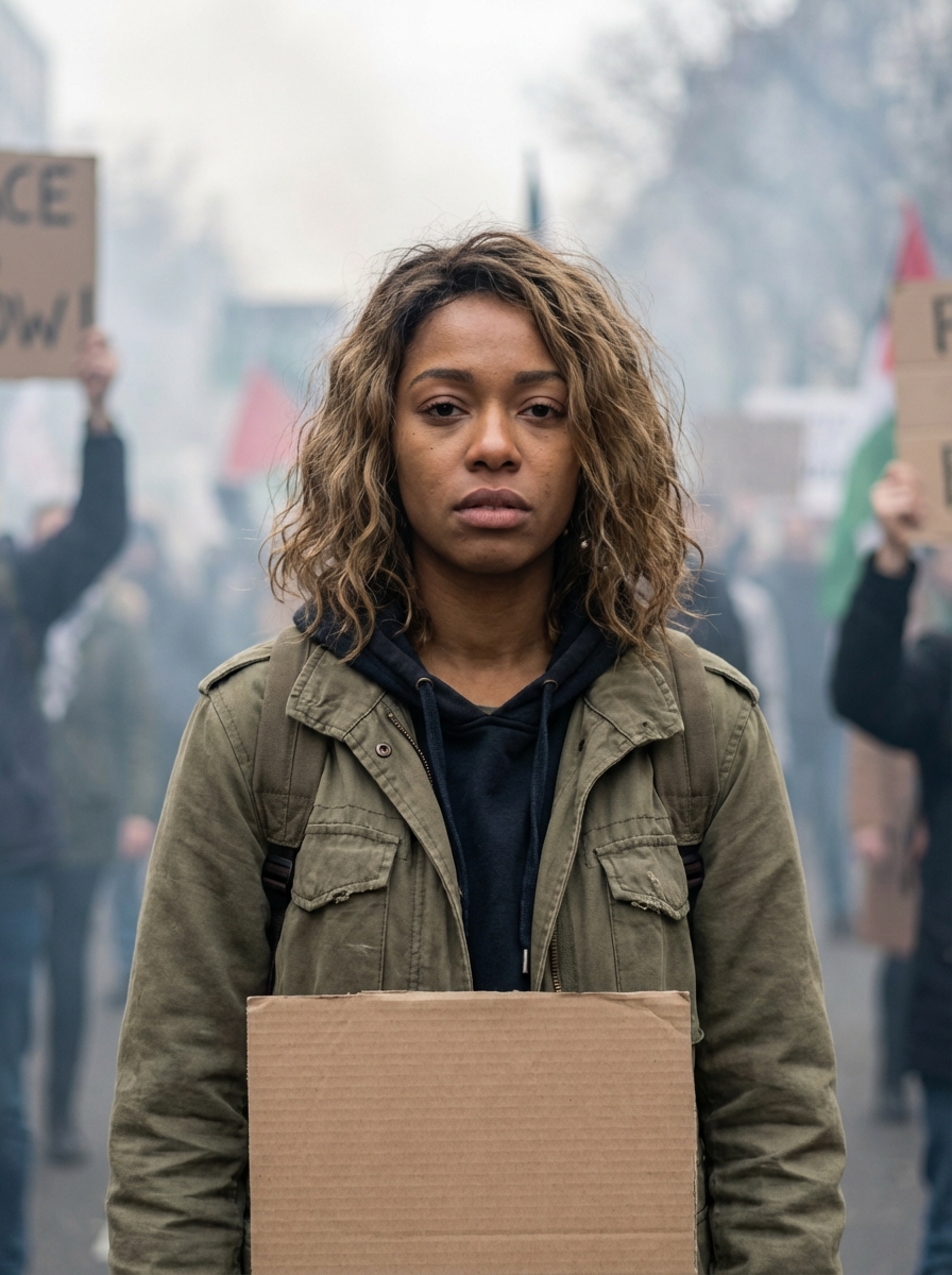 {"Objective": "Create an ultra-realistic cinematic documentary-style portrait capturing emotional resilience and quiet determination within a social movement.", "Persona_Details": {"Subject": "Young adult model", "Expression_and_Emotion": {"Expression": "Slightly tired but determined", "Emotion": "Resilience, resolve, quiet strength"}, "Appearance": {"Hair": "Wavy, shoulder-length hair ", "Makeup": "Natural, minimal", "Overall_Look": "Authentic, unpolished realism"}}, "Wardrobe_and_Props": {"Clothing": {"Outerwear": "Worn olive-green jacket", "Layering": "Hoodie underneath", "Style": "Practical, lived-in, protest-ready"}, "Accessories": {"Backpack": "Worn backpack on shoulders"}, "Prop": {"Item": "Cardboard protest sign", "Detail": "Blank, no text or symbols", "Interaction": "Held close to the body"}}, "Scene_and_Environment": {"Location": "Active protest or social movement setting", "Background": {"Crowd": "Blurred figures with raised placards", "Atmosphere": "Smoky, hazy air suggesting tension and scale"}, "Depth_Cues": "Crowd and signs softly blurred to isolate subject"}, "Lighting_and_Mood": {"Lighting": "Soft diffused overcast daylight", "Contrast": "Low-to-moderate for realism", "Mood": "Somber, emotional, grounded", "Style": "Natural, observational, documentary tone"}, "Photography_Style": {"Genre": "Documentary-style cinematic portrait", "Aesthetic": "Film still realism", "Lens": "50mm", "Aperture": "f/1.8", "Depth_of_Field": "Shallow, subject isolated from background", "Framing": "Waist-up or mid-torso portrait"}, "Color_and_Grading": {"Palette": ["Muted earthy greens", "Soft browns", "Desaturated neutrals", "Subtle skin tones"], "Grading": "Cinematic, slightly desaturated, natural contrast"}, "Detail_and_Quality": {"Texture_Detail": ["Fabric wear on jacket", "Natural skin texture", "Fine hair detail", "Atmospheric smoke"], "Grain": "Subtle film grain", "Realism": "Photorealistic, documentary-level authenticity"}, "Quality_Tags": ["Ultra-realistic", "Photorealism", "Documentary portrait", "Emotional storytelling", "Film still aesthetic", "Social realism"], "Negative_Prompts": ["Text on sign", "Logos", "Watermarks", "Stylized fashion look", "Overly dramatic lighting", "Cartoon or illustration style", "Over-retouched skin"], "Output_Constraints": {"Text_Overlay": false, "Branding": false, "Watermark": false}, "Response_Format": {"Type": "Single image", "Aspect_Ratio": "3:2 or 4:5 recommended", "Use_Case": "Documentary storytelling, cinematic social realism, editorial photojournalism"}}