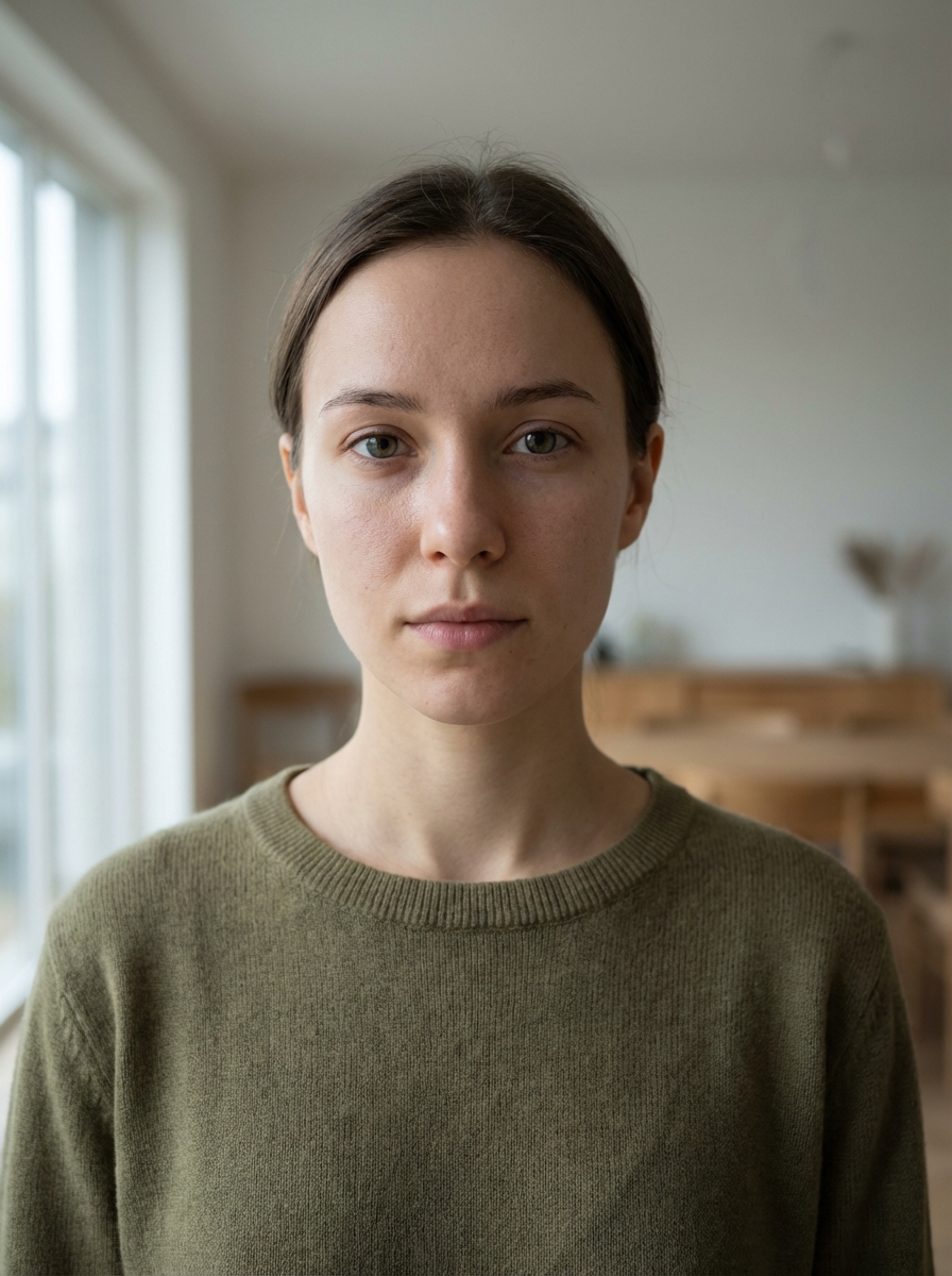 {"Objective": "Create an ultra-realistic cinematic portrait of a young person with a modern, natural, and emotionally subtle aesthetic.", "Subject": {"Age_Group": "Young adult", "Appearance": {"Facial_Features": "Natural, balanced facial proportions", "Skin": {"Texture": "Highly detailed skin texture with visible pores", "Finish": "Natural, no-makeup look"}, "Expression": "Subtle, calm, emotionally understated", "Eyes": "Sharp, expressive eyes in perfect focus"}}, "Lighting": {"Type": "Soft realistic lighting", "Characteristics": ["Gentle highlights on the face", "Soft, natural shadows", "Even illumination without harsh contrast"], "Mood": "Cinematic, intimate, and modern"}, "Camera_and_Technical": {"Camera_Style": "Professional photography", "Lens": "85mm", "Aperture": "f/1.8", "Depth_of_Field": "Shallow depth of field with smooth background blur", "Focus": "Critical focus on the eyes", "Dynamic_Range": "High dynamic range with clean tonal transitions"}, "Background": {"Style": "Softly blurred, clean, and minimal", "Purpose": "Enhances subject isolation and cinematic depth"}, "Visual_Style": {"Resolution": "Ultra-realistic 8K", "Aesthetic": "Modern cinematic realism", "Color_Grading": {"Style": "Realistic, natural grading", "Palette": ["Natural skin tones", "Soft neutral hues"]}, "Detail_Characteristics": ["Ultra-fine facial detail", "Natural shadow gradients", "Photorealistic rendering"]}, "Composition": {"Framing": "Close-up to medium portrait", "Style": "Editorial, clean, distraction-free"}, "Mood_and_Atmosphere": {"Vibe": ["Authentic", "Calm", "Intimate", "Cinematic"]}, "Constraints": {"Text": "None", "Logo": "None", "Watermark": "None", "Artifacts": "No distortions, no over-retouching"}, "Output_Requirements": {"Format": "Image", "Orientation": "Portrait", "Quality": "Editorial-grade, ultra-realistic, professional photography"}}