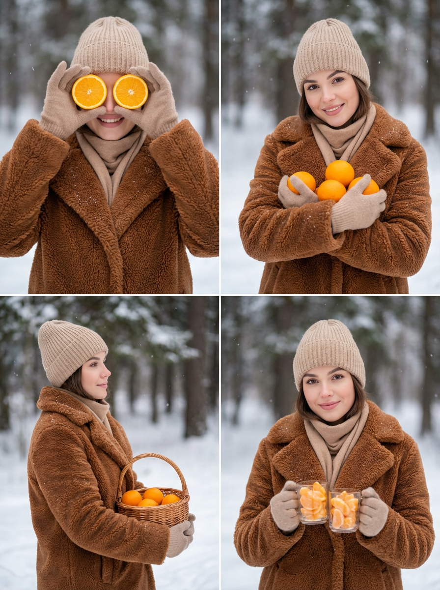 {"Objective": "Create an ultra-realistic cozy winter portrait series with consistent character, wardrobe, and mood, capturing playful lifestyle moments in a snowy forest.", "Series_Type": "Multi-image portrait set", "Consistency_Rules": {"Character": "Same young model across all images", "Outfit": "Identical clothing in every variation", "Hair_and_Makeup": "Consistent natural styling", "Lighting_and_Grading": "Matched across the full series", "Visual_Continuity": "Feels like one cohesive editorial shoot"}, "Persona_Details": {"Subject": "Young adult model", "Expression_and_Emotion": {"Primary_Mood": "Warm, cozy, joyful", "Secondary_Mood": "Playful, lighthearted, natural"}, "Appearance": {"Makeup": "Natural, fresh winter look", "Hair": "Tucked naturally under beanie with soft loose strands"}}, "Wardrobe": {"Outerwear": "Plush brown faux-fur coat", "Headwear": "Beige knitted beanie", "Accessories": ["Matching beige scarf", "Matching beige knitted gloves"], "Style": "Cozy winter lifestyle, editorial-ready"}, "Scene_and_Environment": {"Location": "Snowy forest outdoors", "Season": "Winter", "Weather": {"Snowfall": "Light snow falling gently throughout the series"}, "Background": {"Trees": "Snow-dusted forest trees", "Depth": "Softly blurred background with cinematic bokeh from falling snow"}}, "Lighting_and_Mood": {"Lighting": "Soft diffused winter daylight", "Color_Contrast": {"Warm": "Earthy browns, oranges, beige tones", "Cool": "Soft snowy whites and pale blues"}, "Mood": "Cozy, wholesome, intimate winter atmosphere"}, "Pose_Variations": {"Shot_1": {"Pose": "Holding orange slices playfully in front of her eyes", "Expression": "Playful smile, joyful energy"}, "Shot_2": {"Pose": "Smiling while holding whole oranges close to her chest", "Expression": "Warm, gentle smile"}, "Shot_3": {"Pose": "Side profile carrying a woven basket filled with oranges", "Expression": "Calm, content, candid lifestyle moment"}, "Shot_4": {"Pose": "Holding two glass cups filled with orange segments", "Expression": "Soft smile, cozy winter charm"}}, "Photography_Style": {"Genre": "Lifestyle editorial photography", "Lens": "85mm", "Aperture": "f/1.8", "Depth_of_Field": "Shallow, subject isolated from background", "Framing": "Medium to medium-close portraits"}, "Color_and_Grading": {"Palette": ["Warm earthy browns", "Soft beige neutrals", "Vibrant orange accents", "Cool snowy whites and blues"], "Grading": "Cinematic, warm highlights with soft winter contrast"}, "Detail_and_Quality": {"Texture_Detail": ["Faux-fur coat fibers", "Knitted fabric textures", "Natural skin texture", "Snowflakes and orange peel detail"], "Detail_Level": "Ultra-detailed", "Realism": "Photorealistic, professional editorial quality"}, "Quality_Tags": ["Ultra-realistic", "Photorealism", "Cozy winter lifestyle", "Editorial portrait series", "Cinematic bokeh", "Warm storytelling"], "Negative_Prompts": ["Text", "Logo", "Watermark", "Inconsistent outfit", "Different character", "Harsh lighting", "Cartoon or illustration style", "Over-retouched skin"], "Output_Constraints": {"Text_Overlay": false, "Branding": false, "Watermark": false}, "Response_Format": {"Type": "Image series (4 variations)", "Aspect_Ratio": "4:5 or 3:4 recommended", "Use_Case": "Winter lifestyle editorial, cozy brand campaign, seasonal storytelling"}}