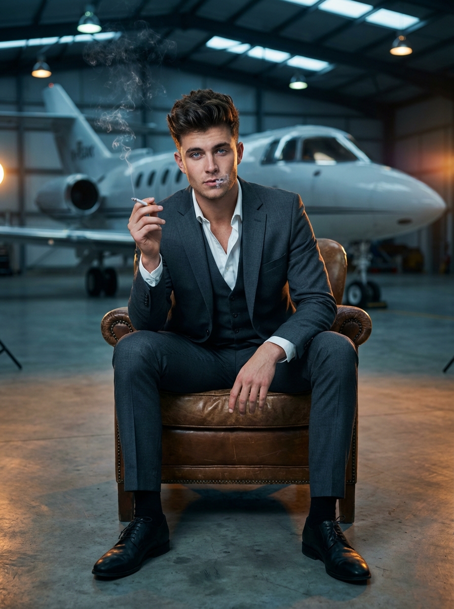 {"Objective": "Generate a high-end cinematic portrait of a confident young model in a luxury aviation setting.", "Subject": {"Gender": "Male", "Age_Group": "Early 20s", "Appearance": {"Eyes": "Deep, piercing crystal blue eyes, highly detailed iris", "Skin": {"Texture": "Smooth, realistic skin pores", "Details": "Clean-shaven, sharp jawline", "Makeup": "None"}, "Hair": {"Style": "Modern textured quiff, voluminous", "Details": "Perfectly groomed, dark brown with subtle highlights"}, "Expression": "Confident, dashy, slightly mysterious gaze"}}, "Wardrobe": {"Clothing": "Tailored charcoal grey slim-fit three-piece suit, crisp shirt unbuttoned at the collar", "Style": "Ultra-modern luxury, 'Old Money' aesthetic"}, "Lighting": {"Type": "Cinematic hangar lighting", "Quality": ["Soft rim lighting to separate subject from background", "Cool-toned overhead industrial lights mixed with warm amber accent lights"]}, "Camera_and_Technical": {"Camera_Style": "Professional Fashion Editorial", "Lens": "35mm wide-angle lens", "Aperture": "f/1.8", "Focus": "Sharp focus on the subject's face", "Depth_of_Field": "Shallow depth of field with soft bokeh on the jets in the background"}, "Visual_Style": {"Aesthetic": "Hyper-realistic, moody, and sophisticated", "Resolution": "8k UHD", "Color_Grading": {"Palette": ["Deep Navy", "Steel Grey", "Golden Amber"], "Style": "High contrast, teal and orange cinematic tint"}}, "Additional_Details": "The model is sitting in a vintage leather armchair in the middle of a massive hangar. Wisps of cigarette smoke are curling elegantly into the air. Multiple sleek, polished private jets are visible in the background."}