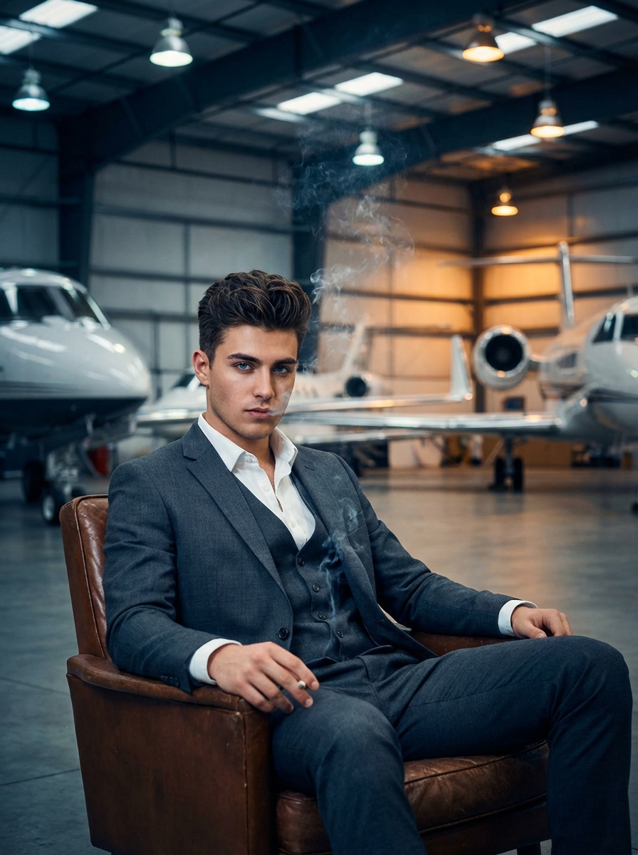 {"Objective": "Generate a high-end cinematic portrait of a confident young model in a luxury aviation setting.", "Subject": {"Gender": "Male", "Age_Group": "Early 20s", "Appearance": {"Eyes": "Deep, piercing crystal blue eyes, highly detailed iris", "Skin": {"Texture": "Smooth, realistic skin pores", "Details": "Clean-shaven, sharp jawline", "Makeup": "None"}, "Hair": {"Style": "Modern textured quiff, voluminous", "Details": "Perfectly groomed, dark brown with subtle highlights"}, "Expression": "Confident, dashy, slightly mysterious gaze"}}, "Wardrobe": {"Clothing": "Tailored charcoal grey slim-fit three-piece suit, crisp shirt unbuttoned at the collar", "Style": "Ultra-modern luxury, 'Old Money' aesthetic"}, "Lighting": {"Type": "Cinematic hangar lighting", "Quality": ["Soft rim lighting to separate subject from background", "Cool-toned overhead industrial lights mixed with warm amber accent lights"]}, "Camera_and_Technical": {"Camera_Style": "Professional Fashion Editorial", "Lens": "35mm wide-angle lens", "Aperture": "f/1.8", "Focus": "Sharp focus on the subject's face", "Depth_of_Field": "Shallow depth of field with soft bokeh on the jets in the background"}, "Visual_Style": {"Aesthetic": "Hyper-realistic, moody, and sophisticated", "Resolution": "8k UHD", "Color_Grading": {"Palette": ["Deep Navy", "Steel Grey", "Golden Amber"], "Style": "High contrast, teal and orange cinematic tint"}}, "Additional_Details": "The model is sitting in a vintage leather armchair in the middle of a massive hangar. Wisps of cigarette smoke are curling elegantly into the air. Multiple sleek, polished private jets are visible in the background."}